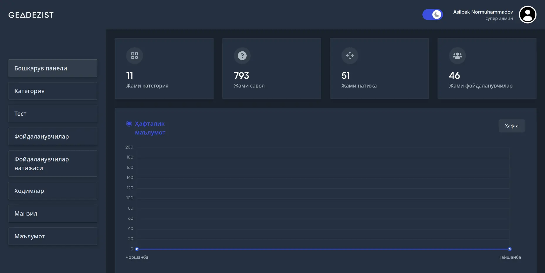GEODEZIYA is a 3-panel website and the program is mainly managed by staff and admin. In the client panel, you can only test the fields. What does the site do? -those who want to be employed in the company are required to pass these tests first, here the employees enter the tests in the direction section and pass the theoretical and practical test there. This site will save the company valuable time and increase productivity.