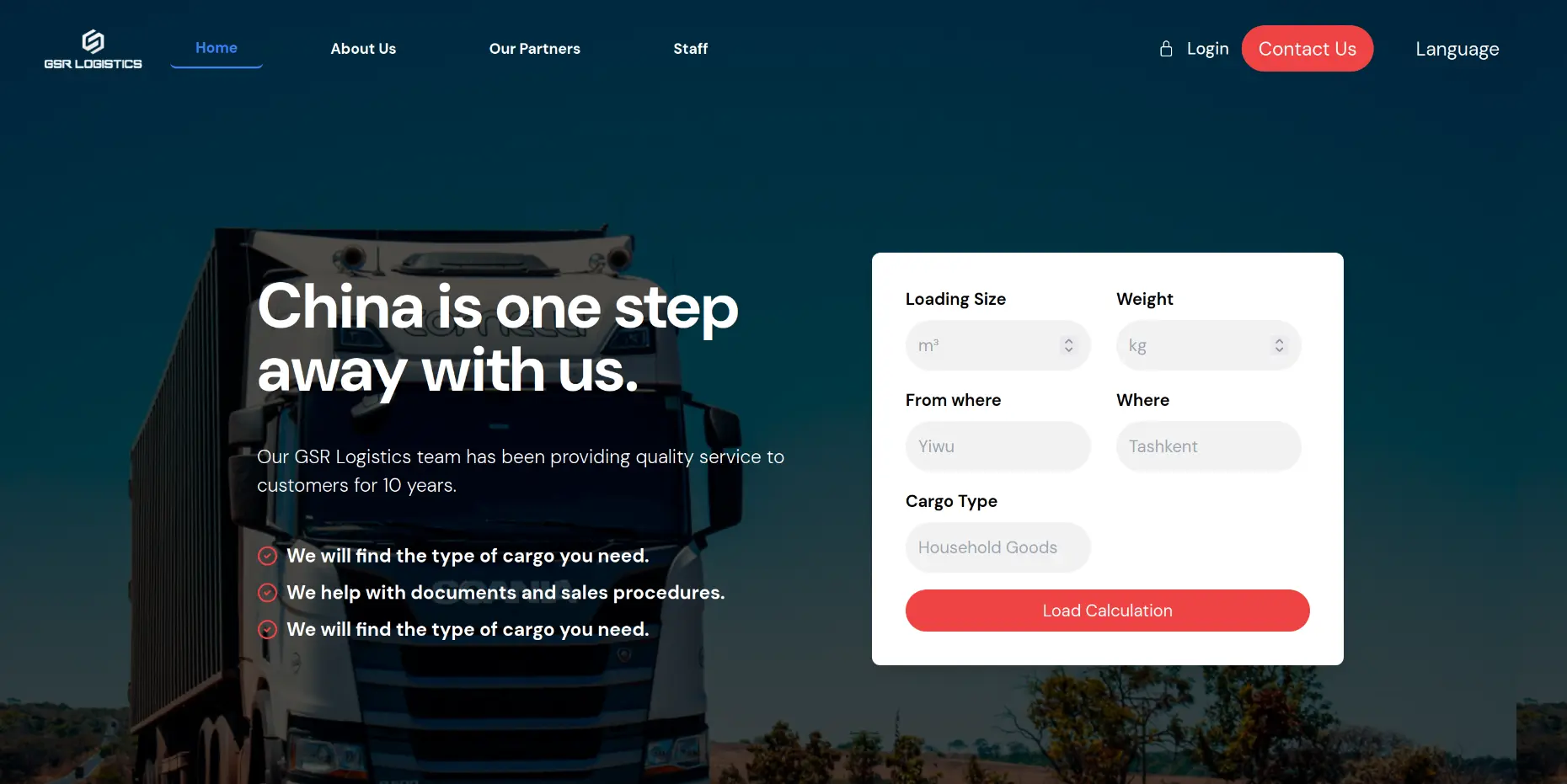 GSR LOGISTIC is a website that controls and organizes bulk cargo transportation between Uzbekistan and China. Through this project, cargo control will be greatly strengthened, and the labor force will be enriched and facilitated. - in addition, the paperwork has been systematized with a much reduced amount. One of the useful aspects is that clients can track the location, status, and arrival of their orders online.